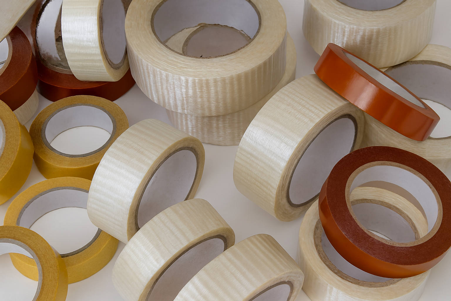 - Cinta adhesiva reforzada: fabricada con fibras de vidrio que aportan máxima resistencia al rasgado y gran capacidad de sujeción. Ideal para el cierre de cajas pesadas y la paletización, asegurando una protección fiable en transporte y almacenamiento.